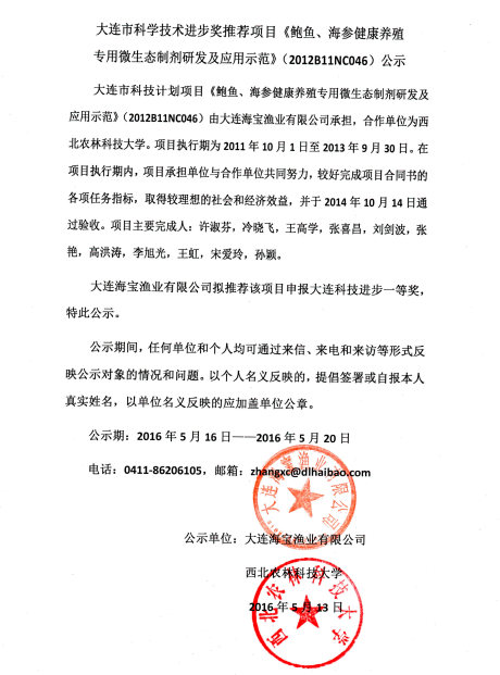 根据相关文件精神,现对大连市科学技术进步奖推荐项目《鲍鱼、海参健康养殖专用微生态制剂研发及应用示范》(2012B11NC46)予以公示,公示期5月20日-5月23日。