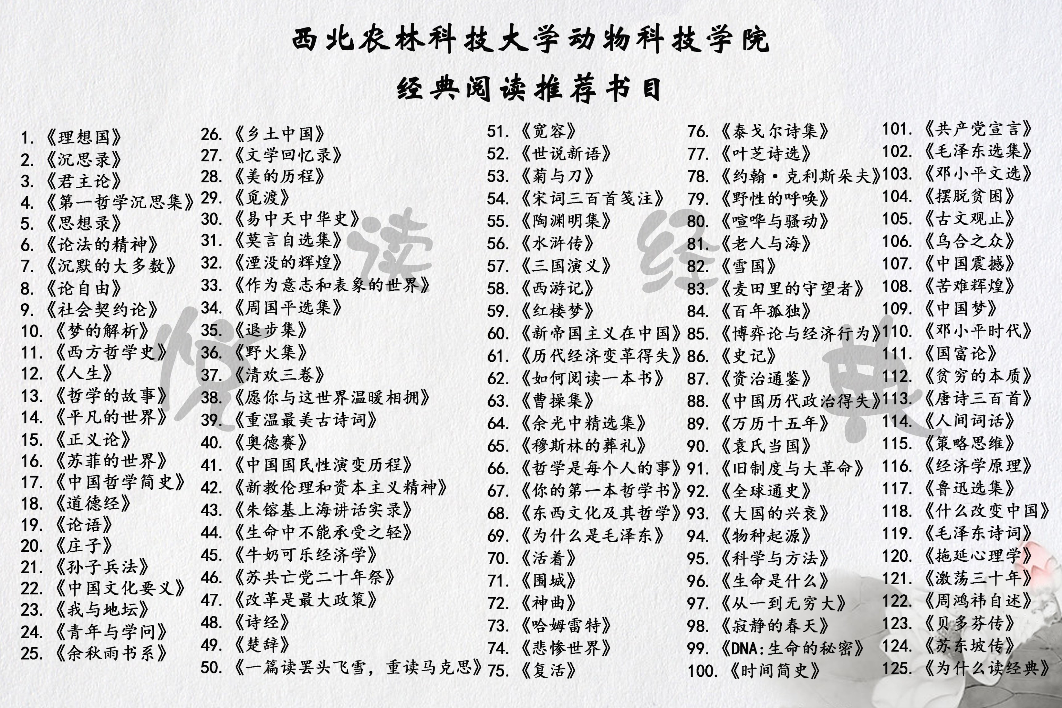 各班学生依据经典悦读推荐书目(见附件1),利用寒假自选1本推荐书籍进行精读,1本泛读,并撰写2篇读书报告。其中,精读书籍读书报告每篇不少于2000字。报告要求包含所选书籍内容概括,感悟体会、收获心得等,两篇报告均上交电子版。各学生班于2月19日收齐读书报告电子版后发送至[email protected],命名方式为“班级+姓名”。学院将组织各班通过主题班会、团组织生活、读书报告会、作品展示、演讲、辩论等形式开展交流。