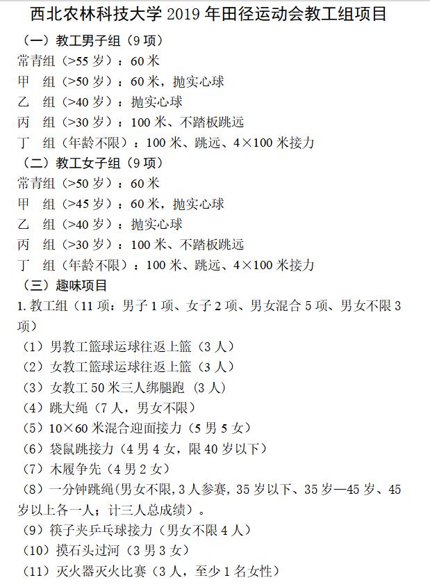 学校2019年田径运动会定于4月18日至19日在北校区田径场举行,现比赛项目报名工作已开始,欢迎各位教职工参照具体比赛项目,积极报名参加。