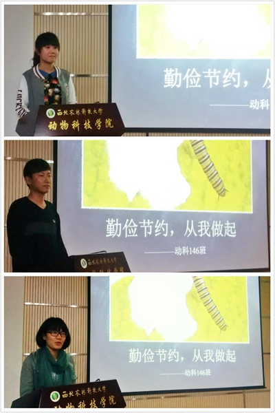 在活动的开始,动科146班团支书刘敏同学首先表明了本次活动的原因和意义。她提出,勤俭节约自古以来就是中华民族的传统美德,作为当代大学生,我们应当以身作则,让勤俭节约不止停留在嘴边,更要履行在生活中。接着,同学们也各自上台发表了他们的意见和倡议。孙伟民同学说到了校园中的许多浪费现象,例如垃圾桶中只用过一面的稿纸,网购了不实用的东西等等。陈星伊同学则是倡议将“光盘行动”进行到底,她强调,勤俭节约不是一件离我们很远的事,我们每个人都要从身边做起,才能实现真正意义上的节俭。