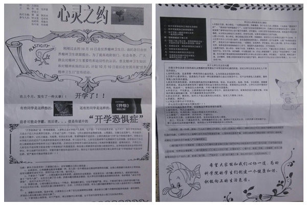 为积极响应“世界精神卫生日”宣传活动的号召,积极做好学院学生心理健康教育工作,同时引导、号召广大学子关注自身健康,正视自身问题,切实提高其心理素质,10月18日,百家乐策略 于西区13#、2#宿舍楼发放了最新一期的“心灵之约”期刊,以便帮助大一新生能够快速调节心理状态,尽早适应大学生活。