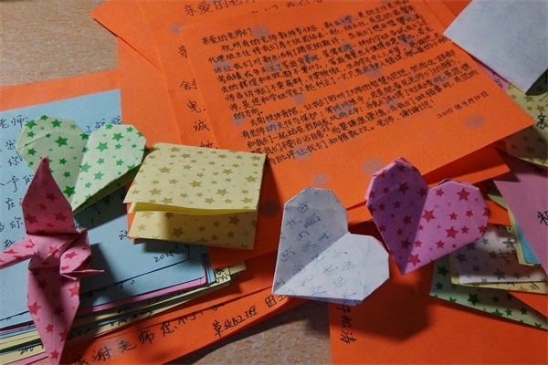 教师节当日,2015级新生以班级为单位领取彩色卡片,将其分发给全体同学,于其上写下自己对辅导员老师的感恩寄语,回想起短暂的军训时光中,学院老师为他们付出的心血和汗水,在人生新征程中给予他们的关怀和指引,同学们都有满腔的话语想要向老师表露。而后,同学们齐心协力,将满载着15级新生对辅导员感谢之情与祝福话语的卡片进行整理,将其制作成纪念册,由挑选出的新生代表将纪念册一一送到15级辅导员手中,以表达全体大一新生对三位老师的感激之情。一句句朴实无华的话语,一段段发自肺腑的语句,足以看出这些初入大学的新同学对老师的敬佩与感激之情。