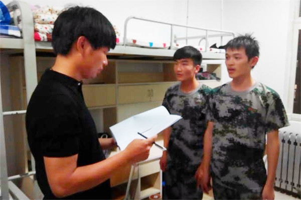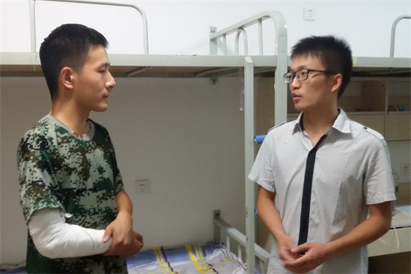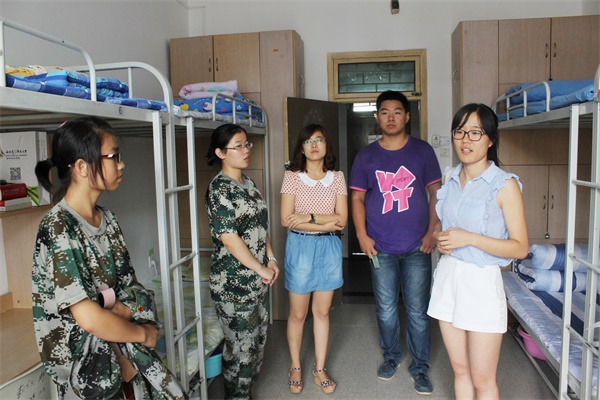 新生宿舍里,老师及学生干部的到来受到学生们热烈的欢迎,不少同学主动与老师们交流了自己初来校园、参加军训的感受。张士军老师亲切询问了同学们的食宿情况,重点关注了与高年级混宿的新生宿舍,并转达了学院领导对新生混宿问题的重视,将尽快对宿舍进行合理的调整。新生也由此对学院的关心表示感谢,并由衷感谢同宿舍高年级同学近期的帮助。邓昌海及赵海东老师则着重向同学们强调了宿舍卫生的重要性,劝诫新生应当注意个人卫生,及时打扫宿舍,营造良好的氛围。