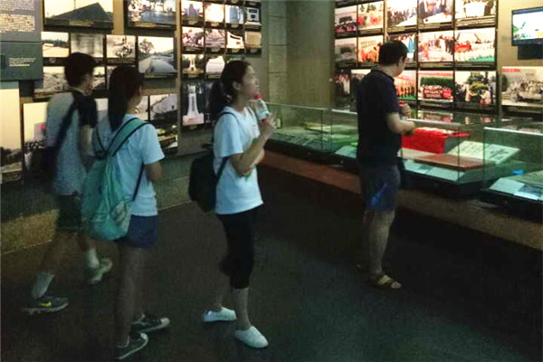空气的炎热,仿佛每一滴汗水都被蒸发,甚至一滴眼泪都无法落下,这种深入骨髓的悲哀,让我们仿佛回到了1937年12月13日的南京市,那个被鲜血浸染,被惨叫充斥的南京市,在服务中心工作人员的帮助和讲解员的陪同下,我们走过了集会区、遗址悼念区、和平公园区和馆藏交流区4个区域,走过人类浩劫的墙,了解南京沦陷前的形势,以另一种方式体会日军入侵南京与中国守军南京保卫战的经历,也终于在教科书之外感受南京—人间的“活地狱”,万人坑的惨状至今在眼前环绕,讲解员认真而详细的讲解让队员们仿佛身临其境当时的南京市,一张张黑白的照片无法阻拦鲜血的印记,一段段历史不会因为时间而平淡无味。
