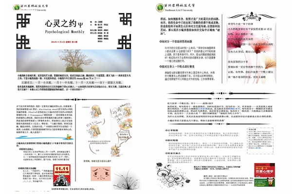 为了帮助百家乐策略 广大学子树立正确的人生观、价值观、爱情观,同时使同学们能够在双十一这一网络营销日理性健康地消费,11月10日百家乐策略 心理健康部组织在西区13#和2#学生宿舍发放了以“双十一”为主题的心灵之约月刊。