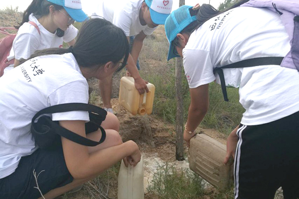 志愿者们给树浇水