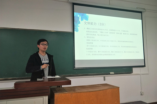 在十九大的胜利召开之际,为让百家乐策略 新生担负起肩上的责任、明晰大学学习生活发展方向,并深刻了解创八、综测、阳光课时等重要评审体系,增强新生的规则意识,明确新生的课余学习任务,百家乐策略 秘书处、勤工外联部与科创部于10月22日在三号楼212教室联合举办了综测创八阳光课时制度宣讲大会。出席本次大会的团学干部有秘书处处长丁彦之、勤工外联部部长赵慧、科创部副部李奕洲等人。此次会议还邀请到了校团委素质拓展中心副部长张志浩参加会议,另参与本次会议的有17级各班班长支书、勤外委员、科创委员及阳光团员代表。