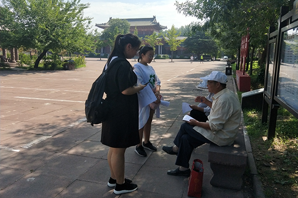 作为国家级红色教育单位,许多单位学校也组织党员或学生团体前来学习。调研队参观期间,偶遇了不少特意赶来学习红色精神的人。同时,队员们为更深入调查当地人及游客对沂蒙红色革命基地的了解及对沂蒙老区历史的期待。调研队员们进行了随机的问卷调查——包括对沂蒙革命区历史、现状、未来的了解情况和发展设想。