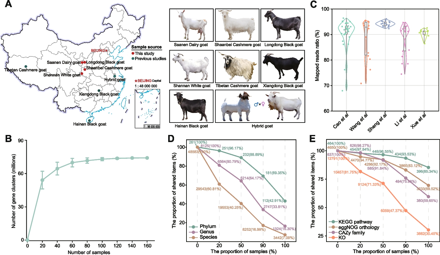 当前,全球乳制品需求持续增长,瘤胃微生物作为奶畜乳合成的关键调控环节,其与宿主脂质代谢的关联机制尚未明确,成为制约乳业提质增效发展的重要瓶颈。为系统性解析瘤胃微生物功能,研究团队历时多年,采集并整合中国6个省份8个山羊品种的160份瘤胃内容物样本。通过深度宏基因组测序与组装分析,成功构建目前最完整的山羊瘤胃微生物参考基因目录(GRMGC),包含7387万个非冗余基因,覆盖90%以上山羊、绵羊瘤胃微生物基因资源。同时,团队从样本中分箱获得5514个宏基因组组装基因组(MAGs)。该基因库能帮助快速识别瘤胃核心微生物,为后续功能验证提供了关键微生物基因组资源。