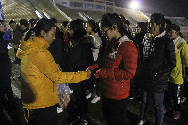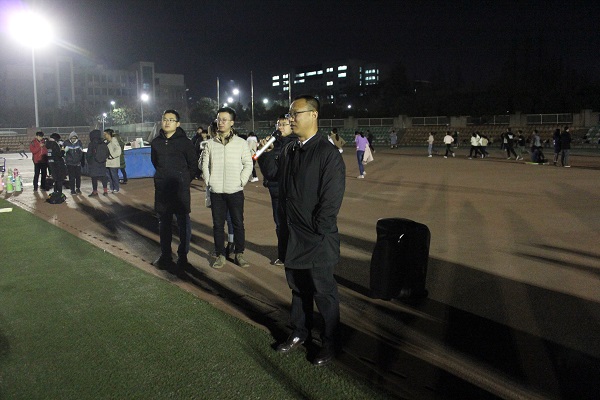 12月11日晚,学院党委副书记王力以及全体辅导员来到田径场,看望为备战越野赛而努力训练的冬训队员们,并给予了同学们亲切慰问。
