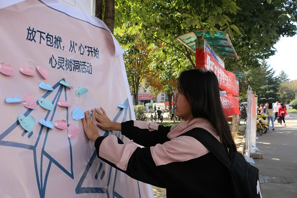 为大力宣传心理健康知识,进一步提升身心修养,缓解新生刚入学时因为不适应大学生活而产生的种种心理问题,帮助新生尽快走出迷茫,适应大学生活,学院心理健康部联合权益部于10月26日中午在西雕举行“心灵树洞”活动,借助本次活动让新生更加关注、重视自己的心理世界,学会适时适度地调节心态、抒发不良情绪,为更好的度过大学生活打下基础。