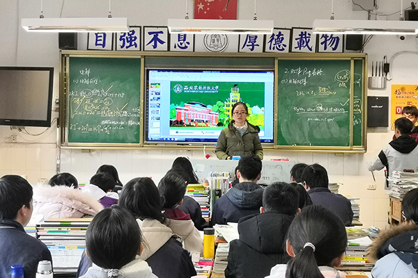宣讲期间,小组三人张贴海报、布置会场、分发奖品,活动进行得井然有序。在重庆市清华中学宣讲期间,小队成员结合精美PPT,从招生计划、人才培养、校园环境、师资力量、出国率、考研率等方面为同学们介绍了西农;在重庆市实验中学宣讲期间,小队成员在报告厅面向全体高三同学详细介绍了西农。期间有同学提出有关报考西农等问题,队员们也都逐一进行解答,介绍到西农的“网红澡堂”和西农锅巴时,队员们明显感受到了学弟学妹们笑声中带着的热切与渴望。