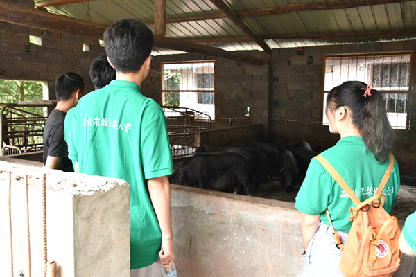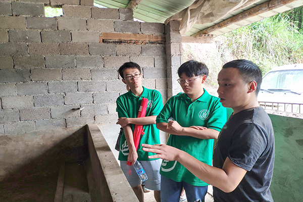 七月的早晨,鸟鸣啾啾,微风习习,迎着晨光,队员们开始了新一天的实践活动,经历了20多分钟的曲折山路,到达了位于山上的养殖场。在养殖场里,袁先生带着队员详细介绍了养殖场的经营模式,经营品种和在带动支持扶贫工作中的作用。经介绍,养殖场主要以高端猪的饲养和销售为主,猪的品种主要为藏香猪、巴山香猪等。此外,还散养一些鸡禽。养殖场周围有酿造苞谷酒的酒厂,猪的食物主要也是由酒厂酿酒后的酒糟与一些农作物混合而成。养殖场内的猪每天都会定时散养在山中,所以这种猪更自然与美味。养殖场的建造也为在农村的人提供了宝贵的就业岗位。