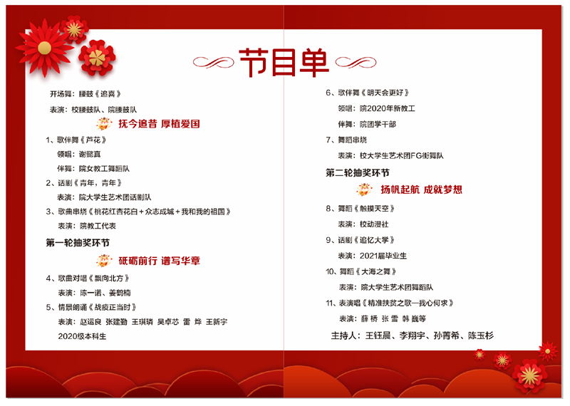 2021年元旦晚会以“青春扬帆 筑梦远航”为主题,分“抚今追昔 厚植爱国”“砥砺奋进 谱写华章”“扬帆起航 成就梦想”三个部分,中间穿插两次互动抽奖环节,欢迎学院全体师生届时踊跃参加。