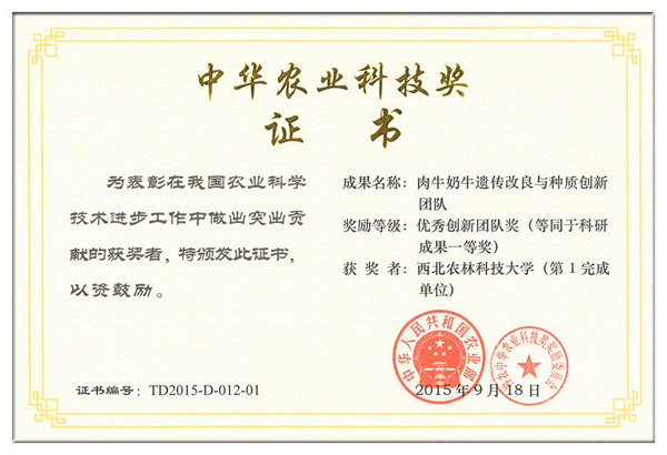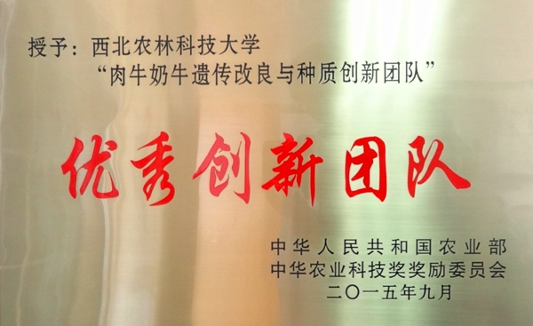 日前,农业部发文公布了“关于2014-2015年度中华农业科技奖的表彰决定” (农科教[2015]4号),百家乐策略 昝林森教授牵头的“肉牛奶牛遗传改良与种质创新团队”荣获“优秀创新团队奖”,等同于农业部中华农业科技奖的科研成果一等奖。