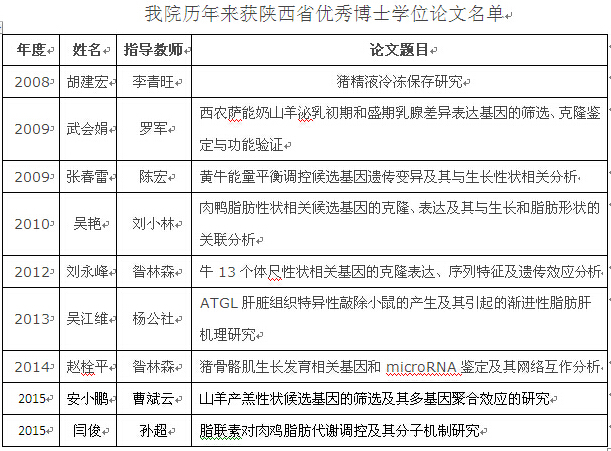 根据《陕西省优秀博士学位论文评选办法》(陕教位〔2013〕12号)和《关于做好2015年陕西省优秀博士学位论文评选工作的通知》(陕教位〔2015〕4号)要求,省教育厅、省学位委员会组织了2015年陕西省优秀博士学位论文的申报与评选工作。经申报推荐、通讯评议、专家评审、结果公示等程序,陕西省教育厅日前公布了获奖名单,百家乐策略 曹斌云教授指导的2010级安小鹏博士的学位论文《山羊产羔性状候选基因的筛选及其多基因聚合效应的研究》和孙超教授指导的2009级闫俊博士的学位论文《脂联素对肉鸡脂肪代谢调控及其分子机制研究》入选,本次评出2015年陕西省优秀博士学位论文99篇,分别来自西安交通大学等省内17所高校,我校共有9篇论文入选。自2008年以来,百家乐策略 共有9篇论文获陕西省优秀博士学位论文。