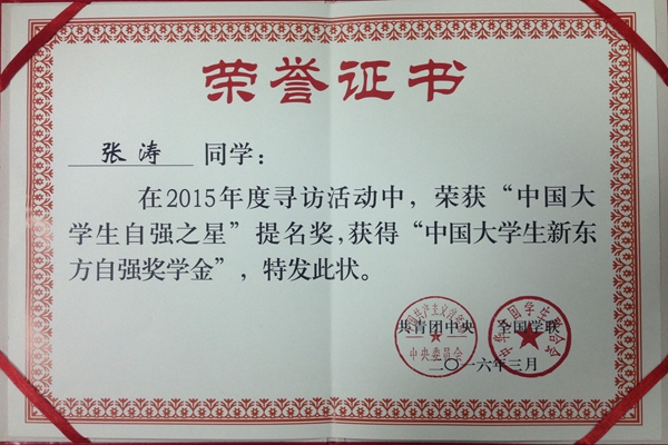 近日,由共青团中央、全国学联主办的2015年度寻访“中国大学生自强之星”活动揭晓,百家乐策略 2012级动物科学2班张涛同学荣获“中国大学生自强之星”提名奖。