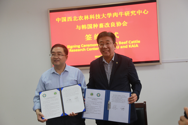 座谈会上,昝林森教授首先对韩国种畜改良协会来我校访问交流表示欢迎,并向客人介绍了我校和学院的发展历史、专业设置和科技优势,以及我校牛业科技创新平台及团队建设运行情况。李在容会长简要介绍了韩国种畜改良协会的情况,希望双方在肉牛品种改良、质量控制等方面加强合作,优势互补。会后,昝林森教授和李在容会长分别代表双方签订了科技合作协议书。