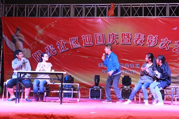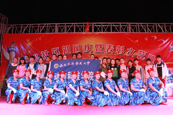 为庆祝祖国67华诞,街道办与学院共同组织庆国庆文艺晚会。陕北腰鼓的热情奔放、合唱独唱的高亢激昂、《桃花谣》的温婉细腻、功夫扇的潇洒气劲、藏族舞、水兵舞、模特舞、国标舞等多种舞蹈的姿态神韵,每一个节目都引来台下观众的掌声与欢呼声,晚会在热闹的氛围中进入尾声。动科学子精心排练的小品《落叶归根》和《大腕归来》,受到了台下观众的热烈欢迎。同学们多次排练与打磨默,契配合,为观众带去欢乐和笑声。同时,小品素材也使得观众得以思考,提倡敬老爱老,发扬中华民族的传统美德,构建和谐社会。