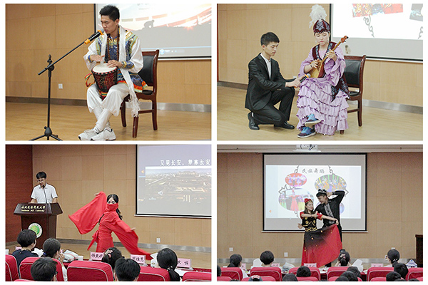 在第一环节“美哉·家乡情”中,各参赛队员协调合作,用灵活俏皮的情景对话,载歌载舞的表现形式对当地丰富多彩的民俗文化活动进行完美诠释。同学们身临其境,在民歌对唱中走进至美青海花儿会,在抒情悠扬的冬不拉声中置身大美新疆,在黄梅戏《天仙配》走进人杰地灵的安徽;在《走西口》中瞥见山西风情,在奶茶肉干中品味大美内蒙,在古风诗词中赏牡丹风韵、在动情朗诵中又见长安。热情好客的藏族同学们更是为评委献上哈达、斟满青稞酒,赢得了在场同学的阵阵掌声。