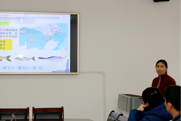 会上,赵延安书记简要介绍了学院的基本概况,刘海侠博士就“以鱼净水”技术在南水北调中线干线的应用研究进行了汇报,详细介绍了通过生物手段来控制水体中氮、磷和藻类,以解决水体富营养化问题。