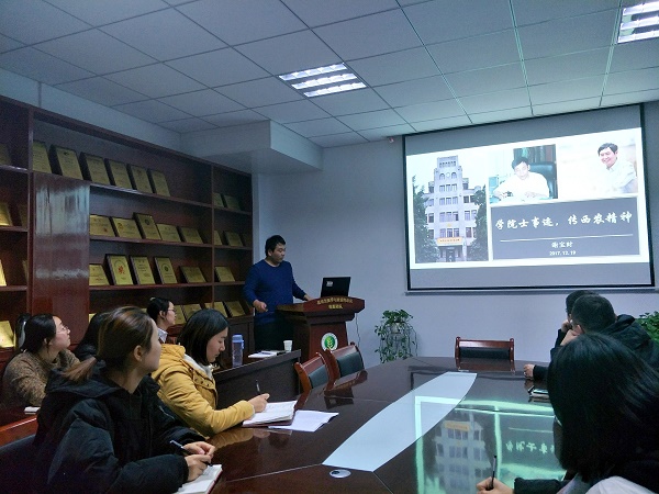 王英茜和谢宝财两位同志详细分享了康振生院士和邵明安院士的主要经历和贡献。康振生院士爱党爱校,在国外毕业后放弃优厚的报酬,毅然回国参与国内实验室组建及管理,服务三农,专心钻研小麦病理学,勇于创新,最后众望所归被评为中国工程院院士后;邵明安院士从物理学向土壤物理学转变,吃苦耐劳,两回黄土高原,扎根黄土,报效祖国,在水保所恪尽职守。同时王英茜同志讲述了西农精神,向广大党员解说了校训“诚朴勇毅”的内含。并阐述了自己对“扎根西杨凌,胸怀社稷,脚踏黄土,情系三农,敢于吃苦,追求卓越”西农精神的感悟。