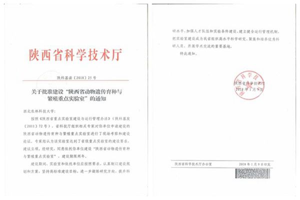“陕西省动物遗传育种与繁殖重点实验室”批文