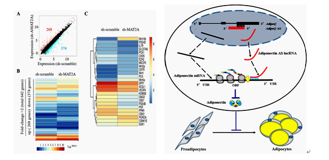 2016年我国生猪产业产值占畜牧业产值的43.2%,占农林牧渔总产值的11.2%,是畜牧业乃至大农业的支柱产业。目前,我国猪肉产量和消费量均居世界第一。尽管猪肉产量已满足国内消费需求,但猪肉品质亟待改善。脂肪组织作为猪胴体的重要组成部分,与猪肉产量和肉质密切相关。我国地方猪品种资源丰富,为76个,位居世界第一。这些猪品种一般具有肉质优异(“大理石纹”明显,肌内脂肪含量高)、繁殖力高和抗逆性强的突出优点,为优质瘦肉型猪新品种的选育提供了宝贵的遗传资源材料。杨公社教授团队30余年来,一直从事地方猪品种和引入猪品种脂肪沉积领域的研究。近年来,从调控猪脂肪沉积的关键功能基因和长链非编码RNA切入,研究发现 MAT2B 通过抑制Wnt/β-catenin信号通路促进猪肌内脂肪细胞聚脂; Adiponectin AS lncRNA与 Adiponectin mRNA形成二聚体,通过阻止Adiponectin蛋白翻译抑制脂肪沉积。上述研究成果,有助于揭示猪肌内脂肪沉积的调控机制,为优质瘦肉型猪品种的选育和健康优质猪肉生产提供科学依据。