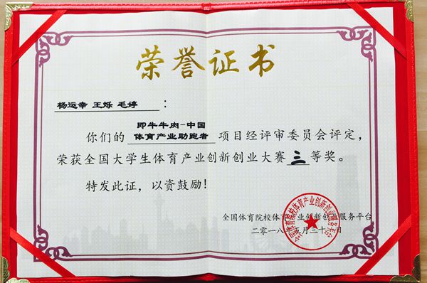 经校级初赛选拔、国赛初赛、复赛、决赛,由百家乐策略 副院长、国家肉牛改良中心主任昝林森教授指导的学院2018届毕业生杨运幸同学牵头完成的《即牛牛肉—中国体育产业助跑者》创业项目总评90分,在创业实践组排名第7,荣获全国大学生体育产业创新创业大赛三等奖,这也是今年我校选拔参赛的三个项目中唯一获奖项目,同时为我校在此项赛事上历史最好成绩。项目及其产品在大赛上受到体育产业方面专家普遍好评和广泛认可。