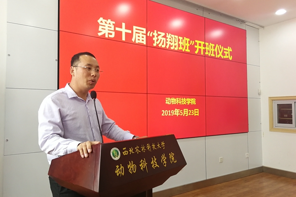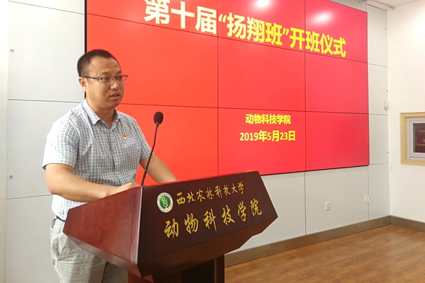 开班仪式上,校友、扬翔集团招聘经理助理陈令祥宣读了第十届“扬翔班”成员名单。动科156班雷杰同学代表第九届“扬翔班”成员发言,他对公司和学院的培养表示衷心感谢,说道:通过在“扬翔班”实习,我们收获了很多,一方面学习到了许多以前没接触过的专业知识与应用实践,另一方面提高了自己的动手能力,在“扬翔班”的实习经历进一步挖掘了我们的潜力,考验了个人的综合素质。”动科161班王钰晨同学作为新一届“扬翔班”学员代表发言。她表示作为本届“扬翔班”学员,将谨记“诚朴勇毅”校训,服从企业的安排与要求,深入了解行业发展,加强实习实践,做到知行合一。