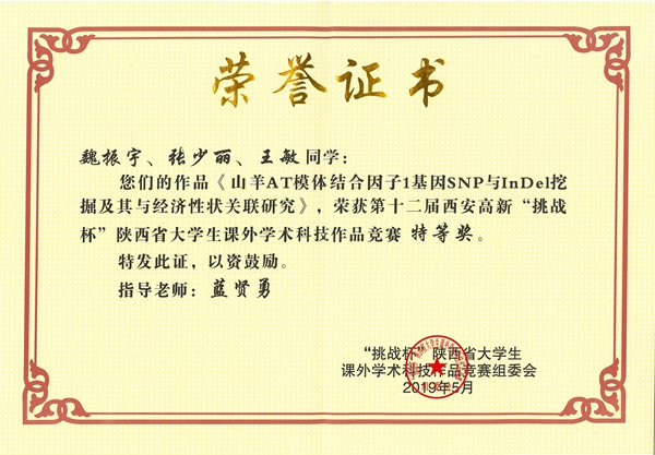 5月25-28日,第十二届陕西省 “挑战杯”大学生课外学术科技作品竞赛终审决赛在西北工业大学长安校区举行,大赛由团省委、省科协、省科技厅等多家单位共同主办,西北工业大学承办。百家乐策略 本科生魏振宇团队(动科1501班魏振宇、创新1501班张少丽、动科1605班王敏)凭借作品“山羊AT模体结合因子基因SNP与InDel挖掘及其与经济性状关联研究”在终审决赛中荣获“特等奖”,将代表我校参加“挑战杯”国家级竞赛。