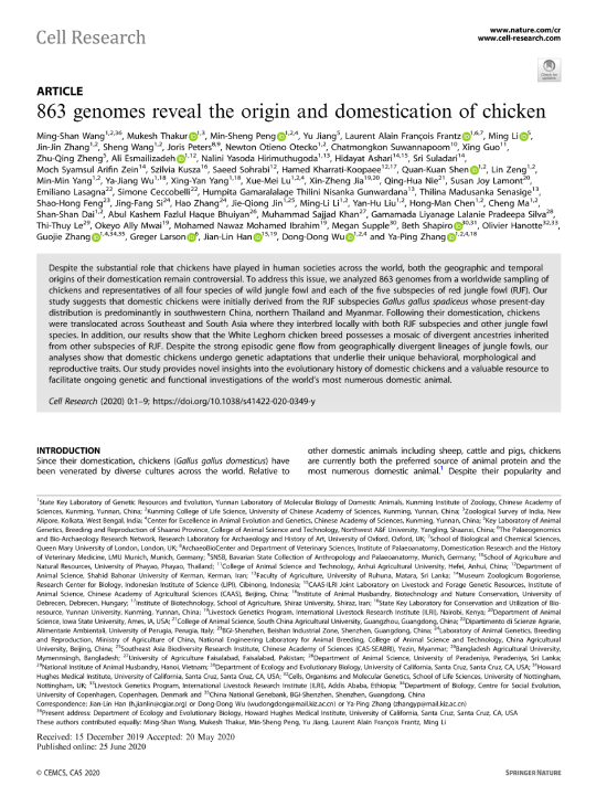 尽管家鸡对全人类的生产和生活产生了世界性的影响,但其驯化的地点和时间仍存在巨大争议。2020年6月25日,中国科学院昆明动物研究所和中国农业科学院北京畜牧兽医研究所牵头,联合国内外30余家高校和科研单位共同完成,在 Cell Research 在线发表了题为“863 genomes reveal the origin and domestication of chicken”的原创性研究论文。本研究首次系统地对包括分布于南亚、东南亚和东亚的地方鸡品种和所有四个原鸡种以及红原鸡五个亚种在内的863份样品的全基因组进行了测定,这一成果为深入认识家鸡的演化过程提供全新的视野,并有助于理解这一地区人类与其它驯化物种(例如水稻、狗、水牛和家猪等)互动的历史。张亚平院士、吴东东研究员及韩建林教授共同通讯,百家乐策略 姜雨教授、中国科学院昆明动物研究所王明山和彭旻晟博士、印度国家动物学普查机构M. Thakur博士、和在读博士生李鸣及英国牛津大学L. A. F. Frantz博士为该论文共同第一作者。