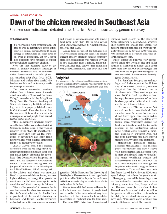 特别值得一提的是,在该论文发表之际, Science 杂志在Animal Domestication专栏发表了题为“Dawn of the chicken revealed in Southeast Asia: Chicken domestication—debated since Darwin—tracked by genomic survey(东南亚鸡的黎明破晓:基因组大数据诠释始于达尔文的家鸡驯化纷争)”的点评文章,通过采访伦敦大学学院的Dorian Fuller博士、威斯康辛大学(麦迪逊)的Jonathan Kenoyer博士(美国艺术与科学学院院士)以及史密森学会的Melinda Zeder博士(美国艺术与科学学院院士和美国科学院院士)等国际考古学著名学者,第一时间对该项研究成果进行系统地盘点。这也是继 Science 于2012年介绍中国农业科学院-国际家畜研究所“畜禽牧草遗传资源联合实验室”韩建林教授有关鸡的研究工作之后,再次深度点评他及合作团队在家鸡起源和驯化方面的重要发现。